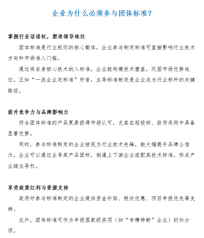 2022年,國家17部門聯(lián)合發(fā)布《關(guān)于促進(jìn)團(tuán)體標(biāo)準(zhǔn)規(guī)范優(yōu)質(zhì)發(fā)展的意見》,鼓勵團(tuán)體標(biāo)準(zhǔn)在招投標(biāo)中的實施應(yīng)用。