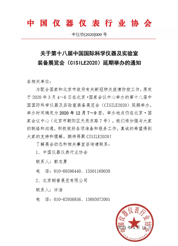 為配合國家和北京市政府有關新冠肺炎疫情防控工作,原定于 2020 年 3 月 4~6 日在北京·國家會議中心舉辦的第十八屆中國國際科學儀器及實驗室裝備展覽會(CISILE2020)延期舉辦,舉辦時間確定為 2020 年 12 月 7~9 日,舉辦地點仍在北京·國家會議中心(北京市朝陽區天辰東路 7 號)。我們將加強與大家的聯絡和溝通,積極做好各項準備和服務工作,真誠的希望得到大家的支持和理解。期待再聚 CISILE2020!