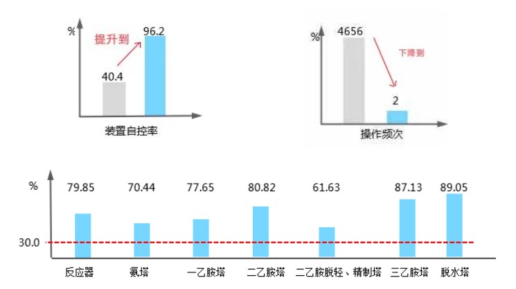 基于以上分析,中控技術結合乙胺裝置工藝特點和過程控制需求,采用多變量模型預測控制,結合專家控制等智能控制策略,實現乙胺裝置多目標優化和協同控制,提高裝置生產運行的平穩性,降低操作人員勞動強度,為生產過程提供安全保障并通過“卡邊”優化,降低能耗。