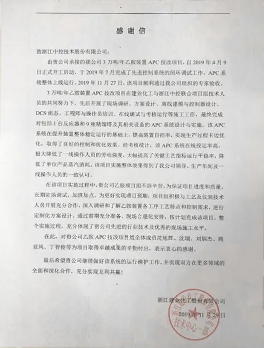 與此同時,乙胺裝置先進控制系統的價值得到了建業化工的一致認可。2020年4月,建業化工再次選擇與中控技術合作,簽訂了異丙胺、乙胺三期、丁胺、正丙胺、醋酸酯等5套裝置先進控制系統;雙方互信共贏,共同促進建業化工逐步走向更高效、更精細、更智能的生產模式,為國內有機胺行業探索一條安全生產、綠色環保、節能降耗、質量提升、降本增效的新路徑。