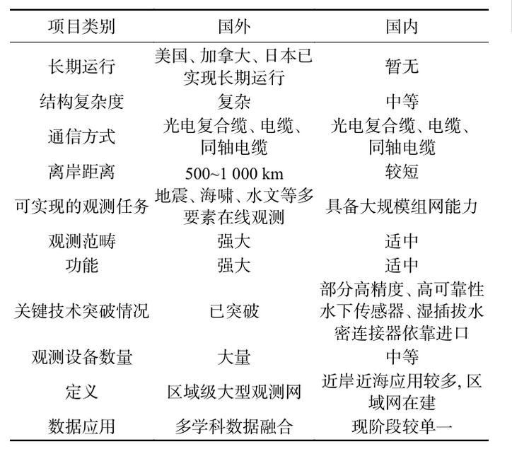 目前,美國、加拿大、日本等西方國家均已建成并運行有區(qū)域級海底觀測網,組網了大量的多源傳感器,并在離岸千米級公里開展了業(yè)務應用。國內海底觀測系統(tǒng)研發(fā)起步雖然較晚,但經過十余年的發(fā)展,已逐漸由單一海底觀測系統(tǒng)發(fā)展至系統(tǒng)組網,在一定程度上已經具備了組網海底觀測系統(tǒng)的能力,并啟動了區(qū)域級海底觀測網的建設工作。但在技術發(fā)展過程中,也存在一定的差距,如亟需突破高精度、高穩(wěn)定性的海洋傳感器和水下濕插拔連接器等關鍵核心技術,國內外主要技術進展比較見表1。