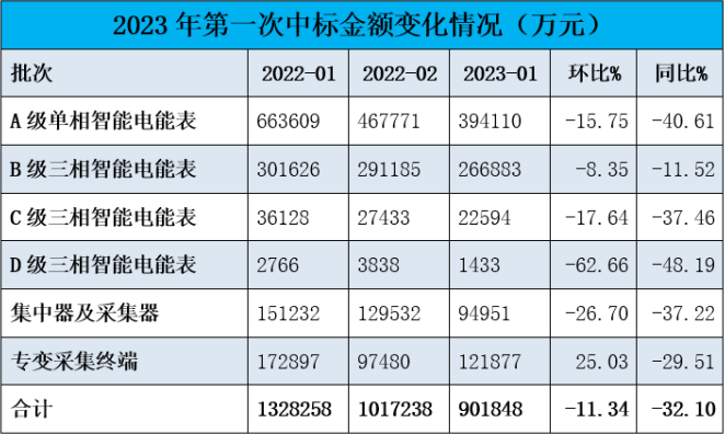 從中標金額的同比和環比數據來看,僅專變采集終端(含能源控制器專變)分標招標金額環比實現增長,D級三相智能電能表分標、A級三相智能電能表分標、C級三相智能電能表和集中器采集器分標同比降幅明顯。