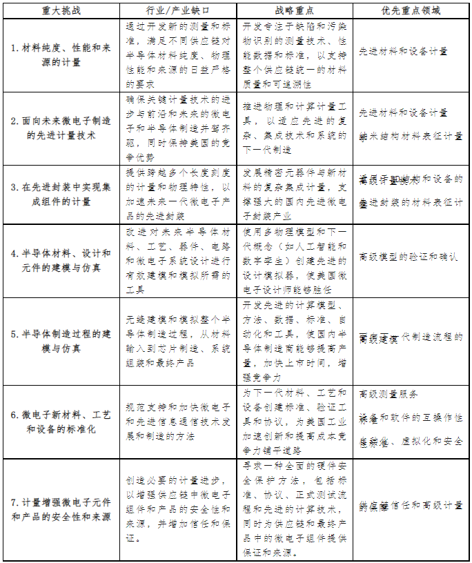 2022年9月的《美國半導(dǎo)體行業(yè)的戰(zhàn)略機遇》報告中,確定了從計量學(xué)角度需要重點關(guān)注的7大挑戰(zhàn),以實現(xiàn)美國領(lǐng)導(dǎo)的全球半導(dǎo)體行業(yè)的未來國家愿景。到2022年11月,芯片研發(fā)計量計劃將其投資組合進一步細(xì)化為10個優(yōu)先重點領(lǐng)域,以解決最關(guān)鍵的計量研發(fā)缺口。七大挑戰(zhàn)及對應(yīng)優(yōu)先重點領(lǐng)域如下: