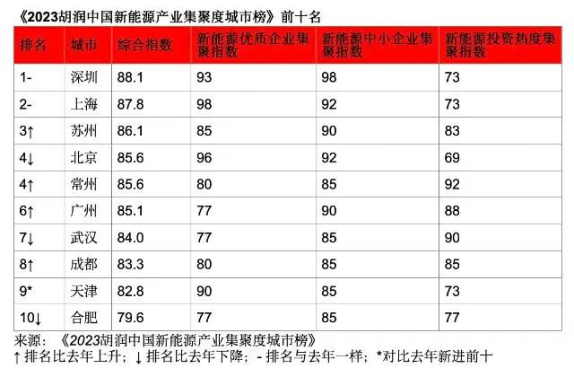 6月19日發(fā)布的《2023胡潤中國新能源產(chǎn)業(yè)集聚度城市榜》(以下簡稱榜單)顯示,深圳、上海、蘇州位列前三,北京、常州則并列第四,廣州、武漢、成都、天津和合肥分列6-10位。