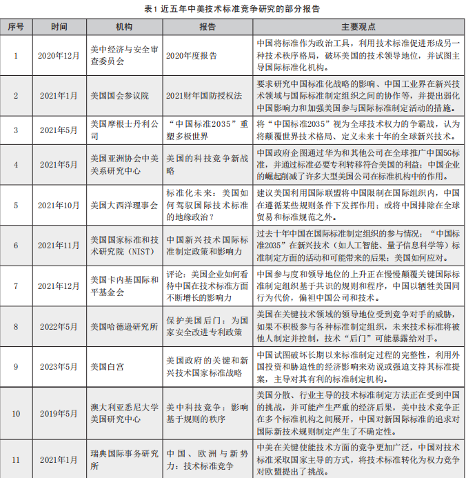 美中經(jīng)濟(jì)與安全審查委員會(huì)是在中國(guó)加入WTO的背景下,美國(guó)國(guó)會(huì)為了監(jiān)測(cè)中美貿(mào)易交往對(duì)美國(guó)經(jīng)濟(jì)與安全影響于2001年特設(shè)的機(jī)構(gòu)。在中國(guó)標(biāo)準(zhǔn)化活動(dòng)研究方面,該委員會(huì)早在2013年就發(fā)布了《中國(guó)在技術(shù)標(biāo)準(zhǔn)上的崛起:舊制度中的新規(guī)范》,報(bào)告稱(chēng),中國(guó)確實(shí)利用技術(shù)標(biāo)準(zhǔn)作為保護(hù)主義的工具,但并未對(duì)美國(guó)構(gòu)成挑戰(zhàn)。此后近十年,由于中國(guó)在標(biāo)準(zhǔn)化方面的努力和國(guó)際影響力的提升引起了美國(guó)的關(guān)注和警惕,從官方部門(mén)到民間智庫(kù),開(kāi)展了大量關(guān)于中國(guó)標(biāo)準(zhǔn)化活動(dòng)的研究,政府也采取了相應(yīng)的政策措施(見(jiàn)表1)。同時(shí),其他國(guó)家也關(guān)注著中美在技術(shù)標(biāo)準(zhǔn)領(lǐng)域的競(jìng)爭(zhēng),如澳大利亞、瑞典等。