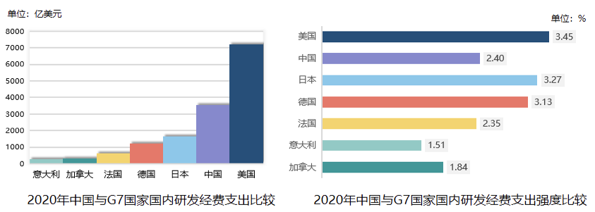 2 中國與G7國家研發經費投入規模及強度比較(2020)