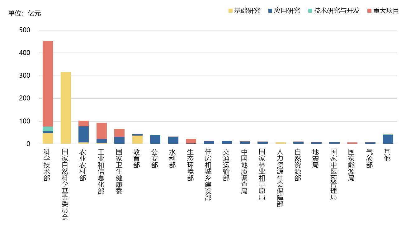 中央政府研發經費主要由少數部門管理。在40個中央政府研發經費管理部門中,科學技術部和國家自然科學基金委員會(簡稱“基金委”)管理經費規模均超過300億元,占中央40個部門管理研發經費總支出的50%以上。就研發經費管理的類型而言,國家基金委經費全部用于基礎研究;科技部和工業和信息化部研發經費主要用于重大項目;農業農村部則將經費主要用于應用研究。