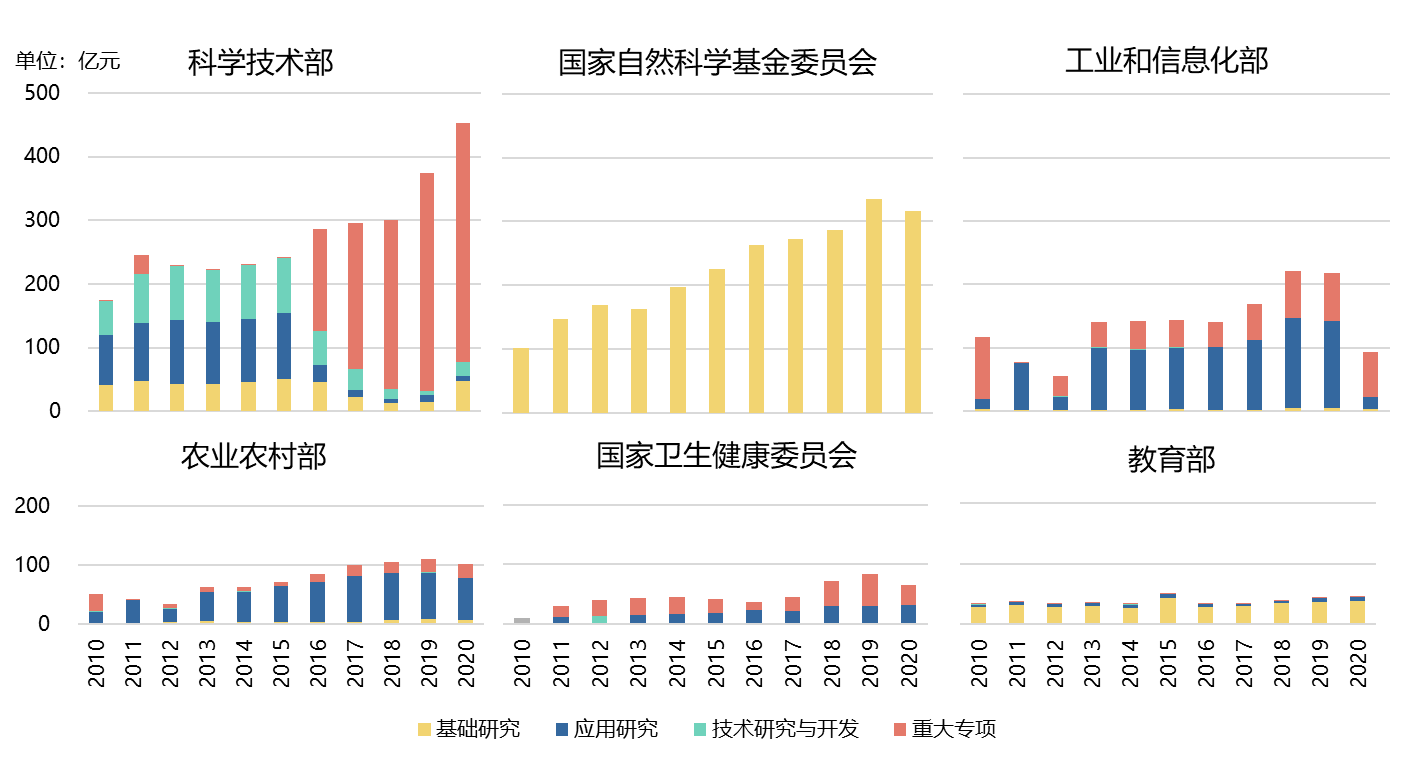 從時間上看,過去十年,科學技術部和基金委研發經費總量大且呈上升趨勢;農業農村部研發經費總量于2020年首次超過工業和信息化部,躍居第三位;衛健委和教育部研發經費總量保持穩定。