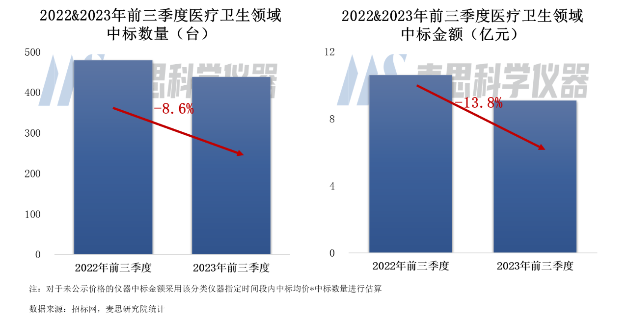 2023年前三季度質(zhì)譜儀器在醫(yī)療衛(wèi)生領(lǐng)域的中標(biāo)數(shù)量達(dá)到438臺(tái),同比下降8.6%。中標(biāo)市場(chǎng)規(guī)模約9.1億,同比下降13.8%。