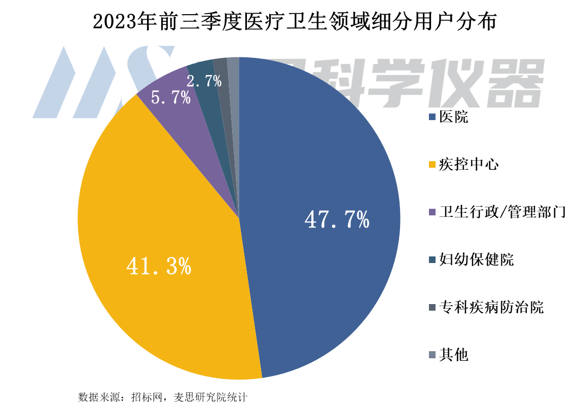 從醫(yī)療衛(wèi)生領(lǐng)域各客戶類型采購(gòu)質(zhì)譜儀器的數(shù)量來(lái)看,醫(yī)院采購(gòu)量占比排名第一,占比47.7%。其次是疾控中心,占比41.3%。