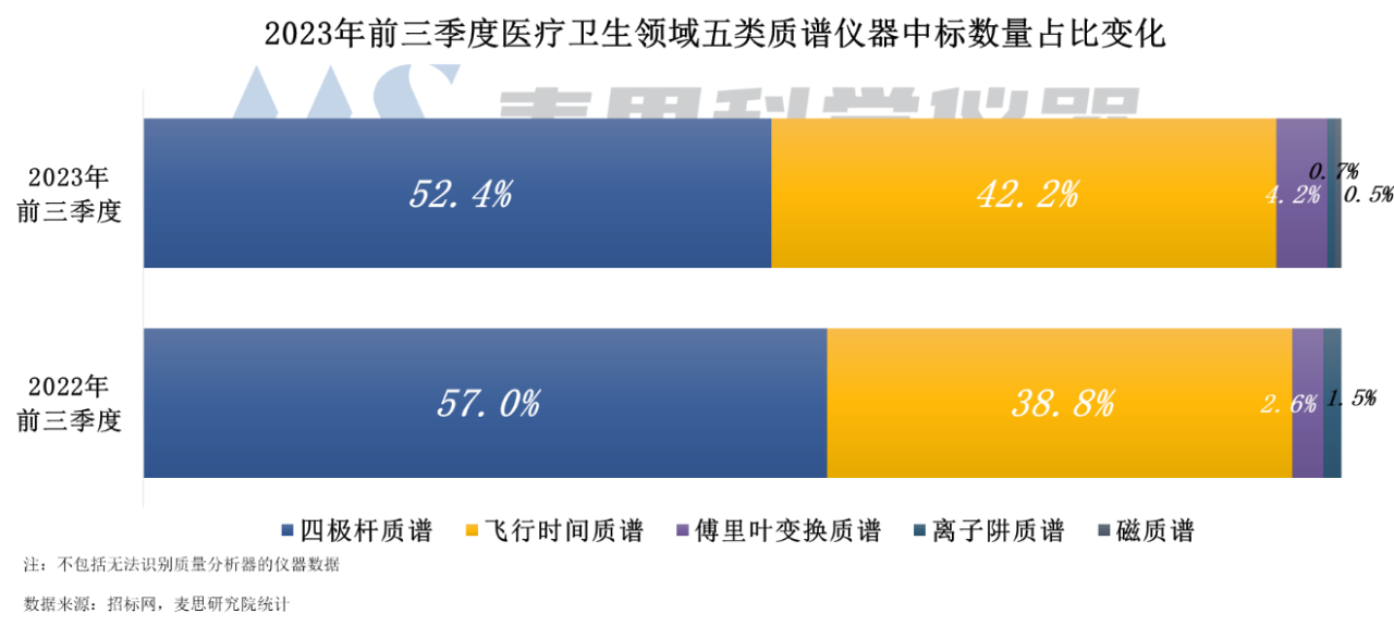 從各技術(shù)路線看,2023年前三季度醫(yī)療衛(wèi)生領(lǐng)域中標(biāo)質(zhì)譜主要為四極桿質(zhì)譜和飛行時(shí)間質(zhì)譜,合計(jì)占比高達(dá)95%。其中四極桿質(zhì)譜中標(biāo)數(shù)量最多,占比52.4%,但同比減少4.6個(gè)百分點(diǎn);其次是飛行時(shí)間質(zhì)譜,占比42.2%,同比增加3.4個(gè)百分點(diǎn);傅里葉變換質(zhì)譜占比4.2%,同比增加1.6個(gè)百分點(diǎn)。離子阱質(zhì)譜、磁質(zhì)譜中標(biāo)數(shù)量極少。