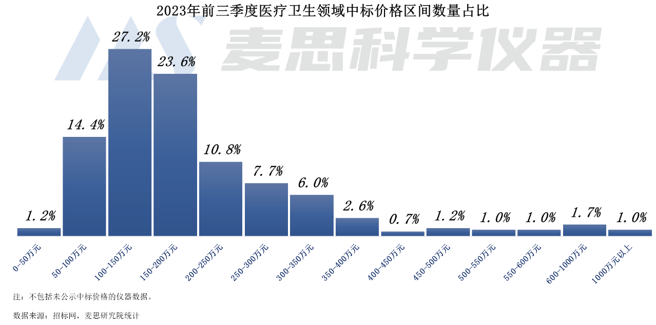 從各價(jià)格區(qū)間的中標(biāo)數(shù)量占比來(lái)看,醫(yī)療衛(wèi)生領(lǐng)域質(zhì)譜儀器中標(biāo)單價(jià)基本在50-350萬(wàn)元之間,占比約90%。其中,單價(jià)在100-150萬(wàn)元以內(nèi)的質(zhì)譜儀器數(shù)量最多,2023年前三季度中標(biāo)數(shù)量占比約27.2%。