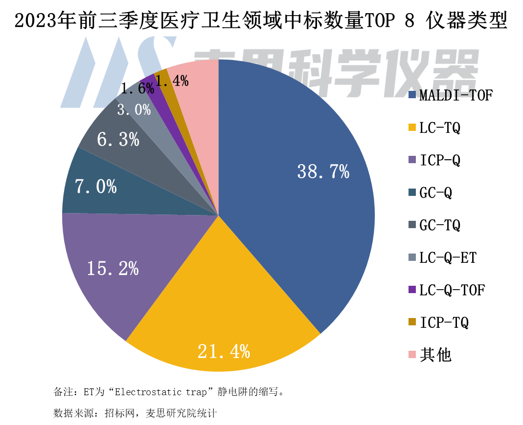 2023年前三季度中標(biāo)數(shù)量Top 8儀器類型分別為MALDI-TOF、LC-TQ、ICP-Q、GC-Q、GC-TQ、LC-Q-ET、LC-Q-TOF和ICP-TQ,中標(biāo)數(shù)量合計(jì)占比約95%。其中MALDI-TOF和LC-TQ是主流產(chǎn)品,占比超60%。