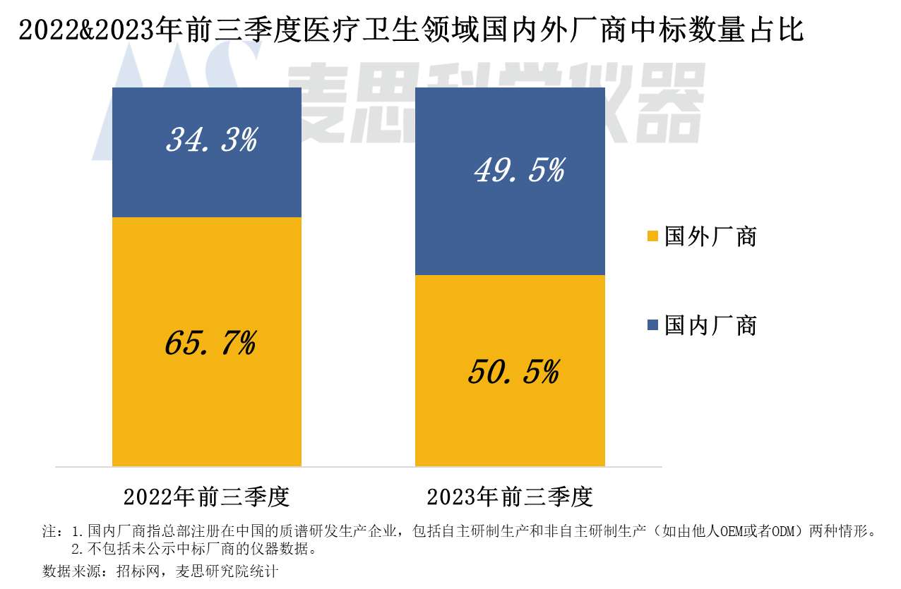 質(zhì)譜儀器中標(biāo)數(shù)量國(guó)產(chǎn)化率較高,與國(guó)外廠商中標(biāo)數(shù)量占比僅有1個(gè)百分點(diǎn)的差距。與2022年同期對(duì)比,2023年前三季度國(guó)內(nèi)廠商在醫(yī)療衛(wèi)生領(lǐng)域的中標(biāo)數(shù)量占比增長(zhǎng)顯著,從34.3%增加至49.5%,增幅15個(gè)百分點(diǎn)。