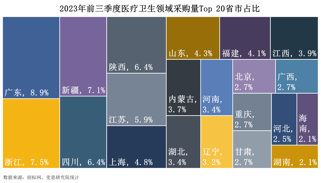 2023年前三季度,廣東、浙江、新疆、四川、陜西為醫(yī)療衛(wèi)生域質(zhì)譜儀器采購(gòu)量的Top 5省份,中標(biāo)數(shù)量占比合計(jì)36.3%。