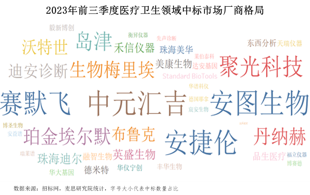 醫(yī)療衛(wèi)生領(lǐng)域中標(biāo)數(shù)量Top 5企業(yè)分別為中元匯吉、安圖生物、安捷倫、賽默飛、聚光科技。相較于其他領(lǐng)域,國(guó)內(nèi)廠商在醫(yī)療衛(wèi)生領(lǐng)域表現(xiàn)優(yōu)異。