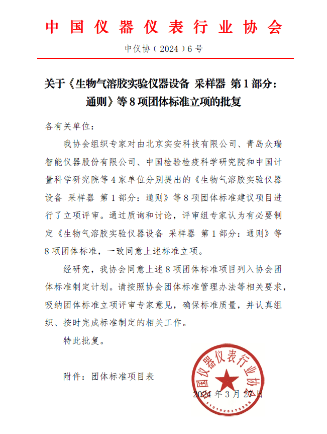 我協(xié)會組織專家對由北京實安科技有限公司、青島眾瑞智能儀器股份有限公司、中國檢驗檢疫科學(xué)研究院和中國計量科學(xué)研究院等4家單位分別提出的《生物氣溶膠實驗儀器設(shè)備 采樣器 第1部分:通則》等8項團(tuán)體標(biāo)準(zhǔn)建議項目進(jìn)行了立項評審。通過質(zhì)詢和討論,評審組專家認(rèn)為有必要制定《生物氣溶膠實驗儀器設(shè)備 采樣器 第1部分:通則》等8項團(tuán)體標(biāo)準(zhǔn),一致同意上述標(biāo)準(zhǔn)立項。
