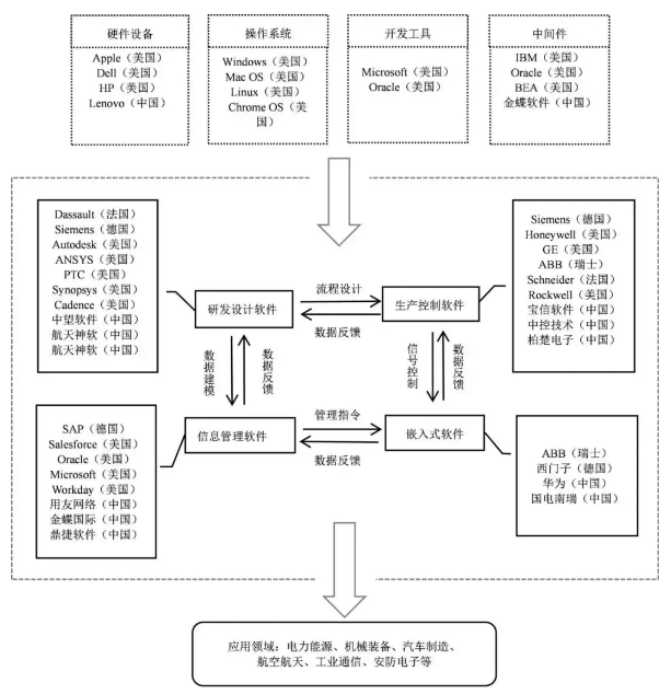 工業(yè)軟件產(chǎn)業(yè)鏈可以分為上游、中游和下游三個關(guān)鍵環(huán)節(jié)。上游主要由提供基礎(chǔ)服務(wù)的軟硬件組成,如計算機設(shè)備、操作系統(tǒng)等;中游包括研發(fā)設(shè)計、生產(chǎn)控制、業(yè)務(wù)管理及嵌入式軟件;下游則是工業(yè)軟件的應(yīng)用領(lǐng)域,如機械裝備、汽車制造等。