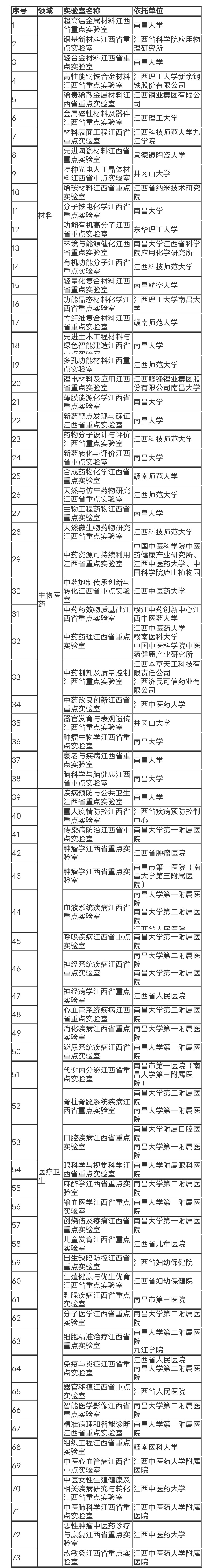 江西省科學技術廳發布江西省重點實驗室擬組建名單,材料領域實驗室17家,包括金屬材料、晶體材料、煤炭材料、新能源材料等;生物醫藥實驗室17家,涵蓋了從靶點發現、新藥研制。合成評價到資源再利用的醫藥研究全線;醫療實驗室42家,有腫瘤、神經系統、呼吸疾病、心血管疾病和代謝內分泌等重要方向。