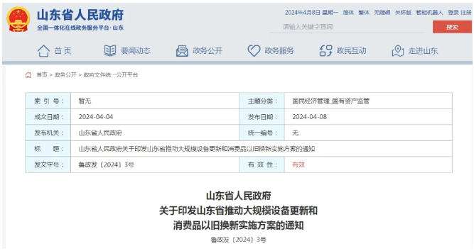 48日,《山東省人民政府關(guān)于印發(fā)山東省推動大規(guī)模設(shè)備更新和消費品以舊換新實施方案的通知》對外發(fā)布。