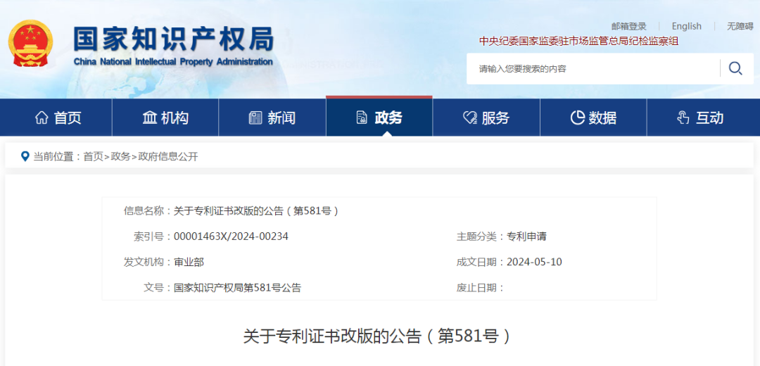 近日,國家知識產權局發布關于專利證書改版的公告(第581號),對于授權公告日在202461日之后(含當日)的專利,國家知識產權局頒發新版專利證書。新版專利證書沿用A4規格豎排版式,優化調整著錄事項布局。