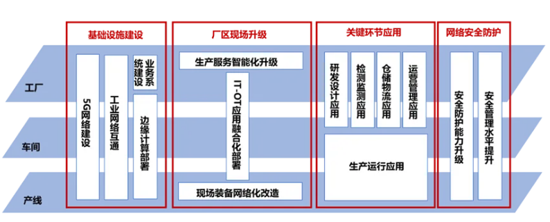 5G工廠建設(shè)內(nèi)容主要包含基礎(chǔ)設(shè)施建設(shè)、廠區(qū)現(xiàn)場(chǎng)升級(jí)、關(guān)鍵環(huán)節(jié)應(yīng)用、網(wǎng)絡(luò)安全防護(hù)等4個(gè)方面。
