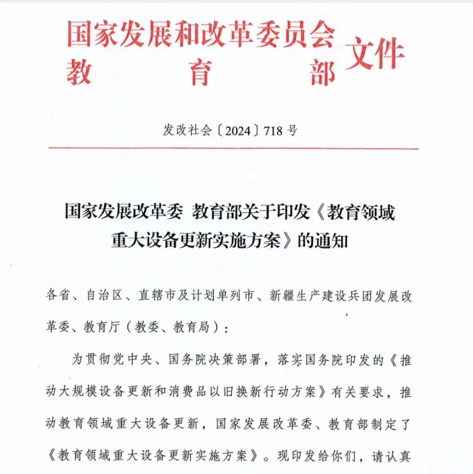 為貫徹黨中央、國務院決策部署,落實國務院印發的《推動大規模設備更新和消費品以舊換新行動方案》有關要求,推動教育領域重大設備更新,特制定本實施方案。