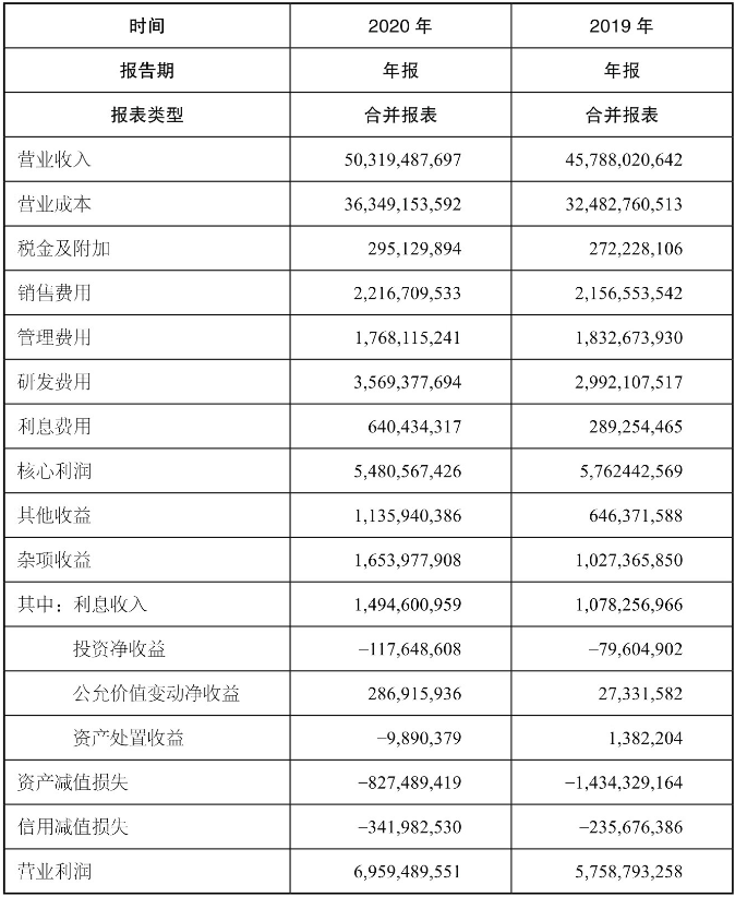 從表中可以看出:在2019年至2020年間,企業的營業利潤成長態勢明顯。企業的核心利潤牢牢占據營業利潤的主體,為支撐企業營業利潤的第一大主力;補貼收益占營業利潤的比重并不大,支撐企業雜項收益的主力軍是利息收入,其他雜項收益并不多。企業聚焦主業、主業具有較強盈利能力的色彩是比較明顯的。