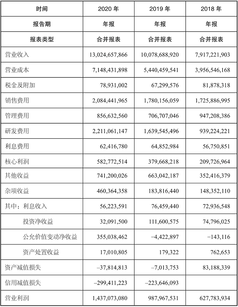 從科大訊飛2018年至2020年合并利潤表的數據可以看到,科大訊飛的營業收入成長性相當不錯——2018年為79億元,2019年為101億元,2020年為130億元;營業利潤的成長性也是不錯的——2018年為6.28億元,2019年為9.88億元,2020年為14.37億元。更重要的是,企業營業利潤的增長速度顯著高于營業收入的增長速度。