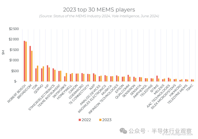 從廠商來看,博世、意法半導體和 TDK 三巨頭繼續領跑 MEMS 傳感器市場,而博通和 Qorvo 則領跑 RF MEMS 市場。博世保持相對穩定的營收,而 TDK 的增長速度超過市場,抵消了意法半導體的下滑。博通在蘋果的 FBAR 業務中失去了很大一部分份額,而 Qorvo 憑借其 BAW SMR 奪回了一部分業務。