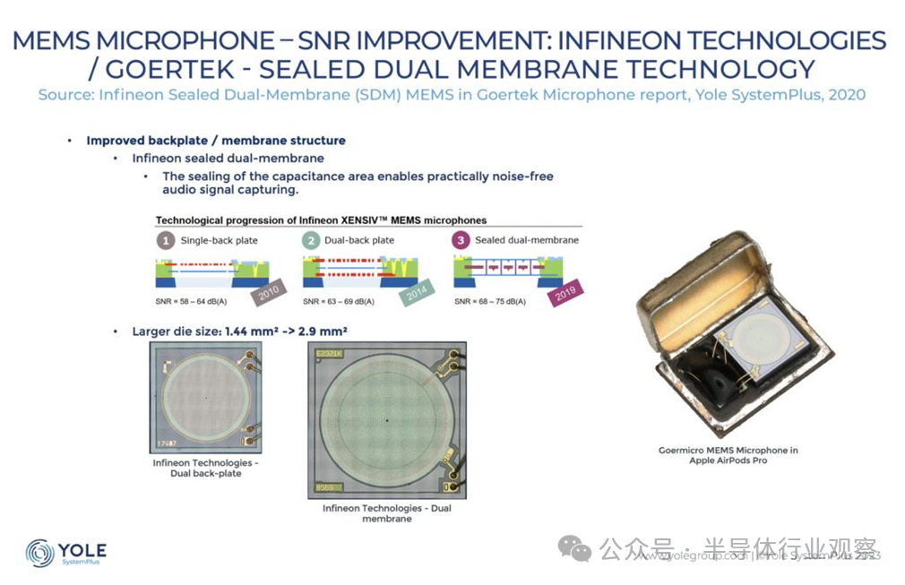 從設計和材料角度來看,MEMS 廠商正在不斷創新,以提高其設備的性能。例如,英飛凌科技在蘋果 Airpods Pro 的歌爾 MEMS 麥克風中采用了密封雙膜技術,顯著提高了 SNR 性能。
