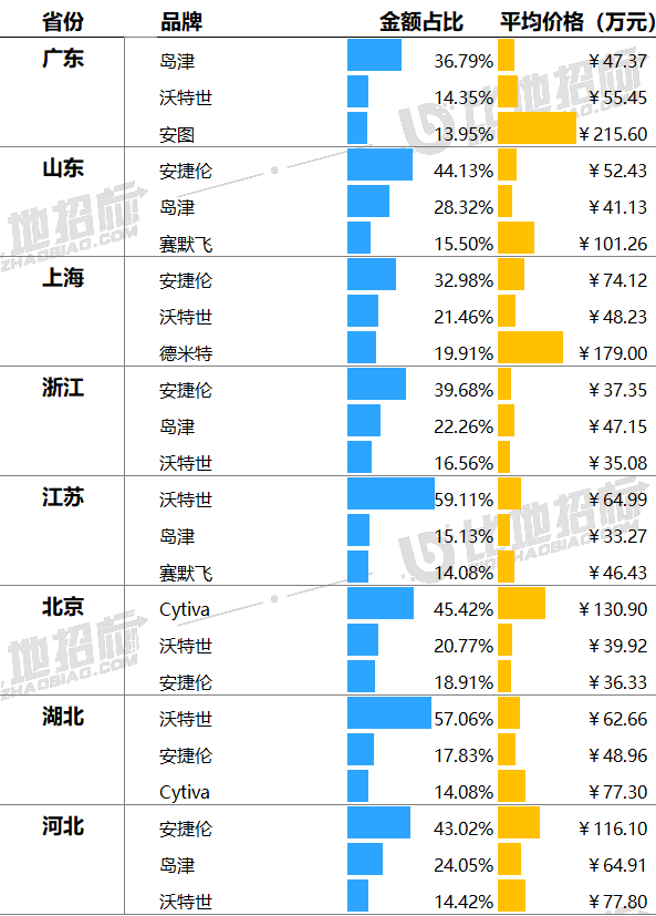 價格方面,廣西、貴州、河北平均金額相對較高,平均單價分別為102.87萬元、87.20萬元、77.97萬元;湖南、新疆、寧夏平均金額相對較低,平均單價分別為29.89萬元、25.42萬元、14.12萬元。