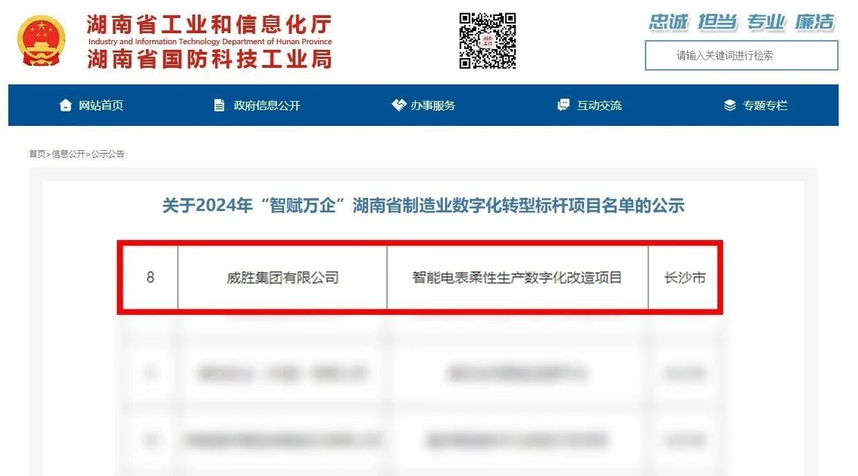 近日,湖南省工信廳公布2024智賦萬企湖南省制造業數字化轉型標桿項目名單,共計遴選了162個湖南省制造業數字化轉型標桿項目,威勝集團有限公司的智能電表柔性生產數字化改造項目成功上榜。