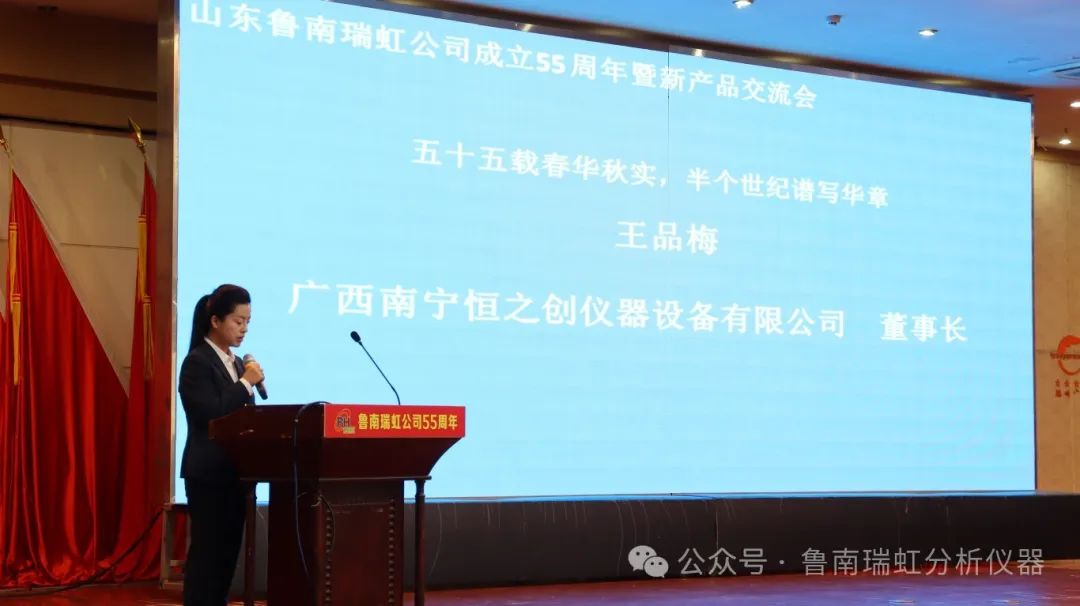 廣西南寧恒之創儀器設備有限公司董事長王品梅登臺致辭。55年以來瑞虹人用自己的汗水和智慧從無到有給中國的化工、化藥、食品檢測等行業創造了有力的分析手段,瑞虹公司的誕生助力了中國化工等相關行業得以更快的發展。