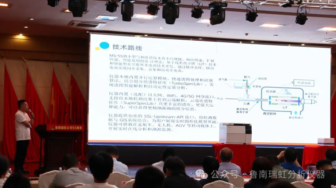 公司研發部負責人孔祥謙詳細的介紹了此次發布的GC-55型氣相色譜儀、MS-55型微小型質譜儀。GC-55搭載10.1寸高清大屏,圖形顯示儀器運行狀態,擁有新一代進樣口、新一代檢測器,快速升溫,極速降溫兼容更多檢測器。MS-55微小型氣相質譜儀本著小巧便捷、響應快速、擴展性強、智能易用的設計理念,基于線形離子阱(LIT)技術和增強型真空紫外光電離技術開發。通過脈沖采樣、阱內電離實現同步采集、富集和高效率電離。