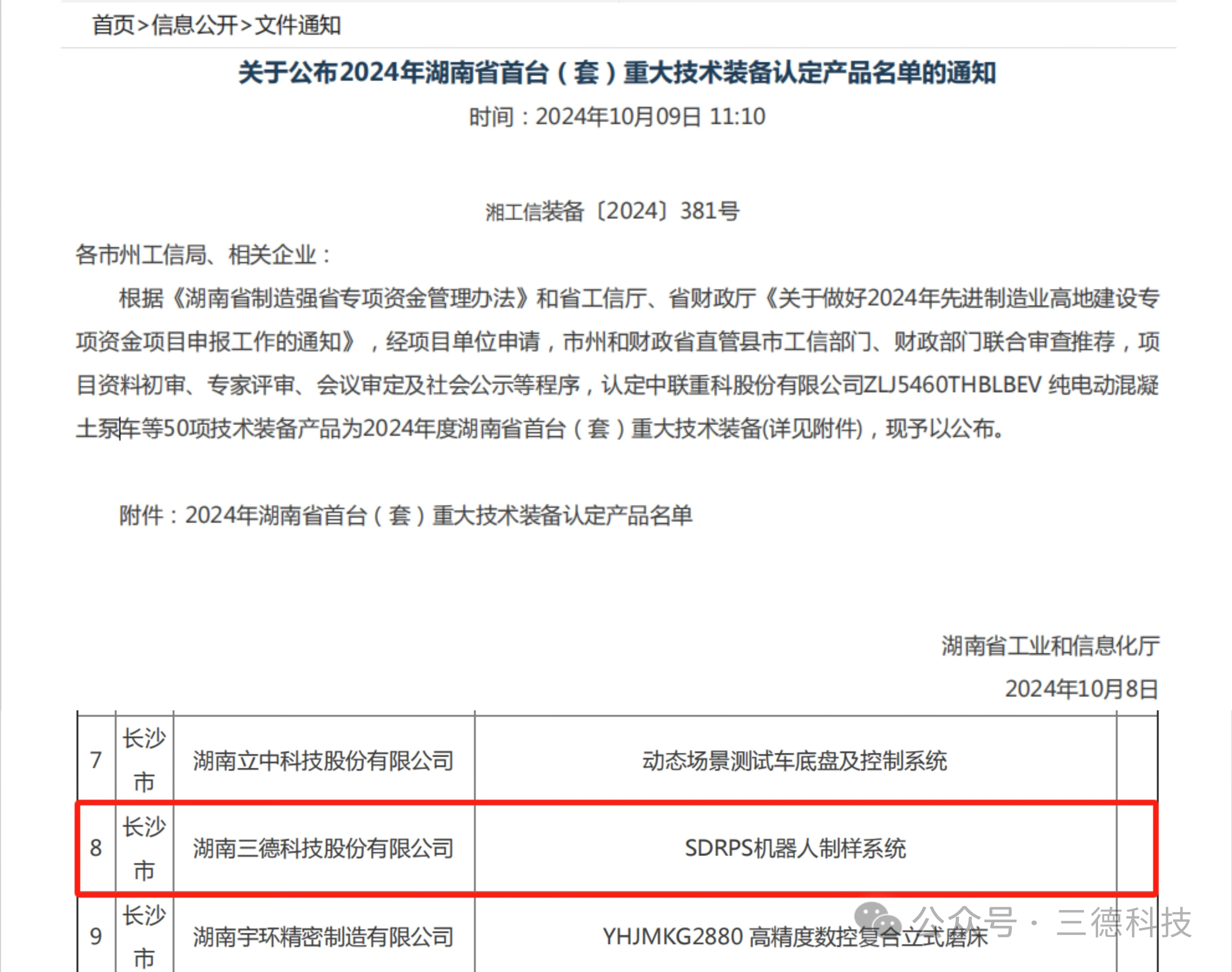 109日,湖南省工信廳公布2024年湖南省首臺(套)重大技術裝備認定產品名單,三德科技自主研制的“SDRPS機器人制樣系統成功入選。