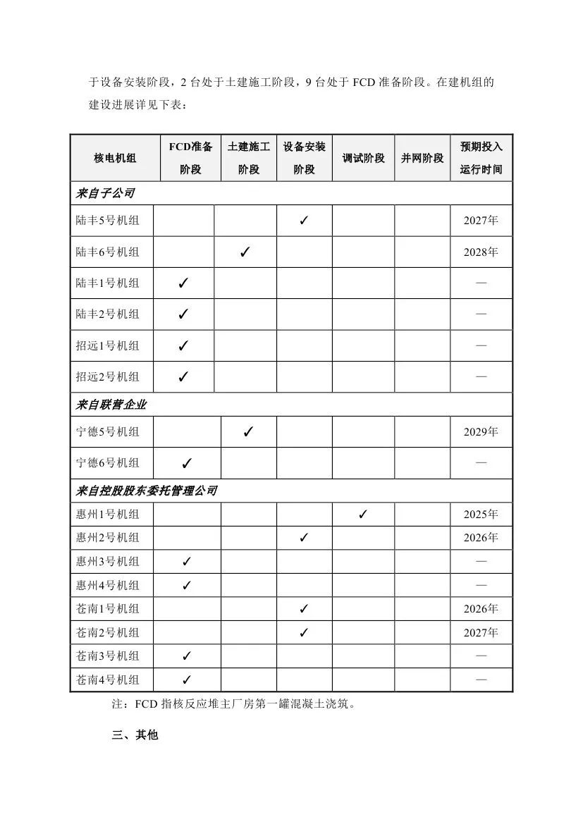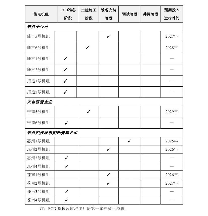 中國廣核表示,截至2024930日,本集團共管理16臺已核準待FCD及在建核電機組(包括本公司控股股東委托本公司管理的8臺機組),1臺處于調試階段,4臺處于設備安裝階段,2臺處于土建施工階段,9臺處于FCD準備階段。在建機組的建設進展詳見下表: