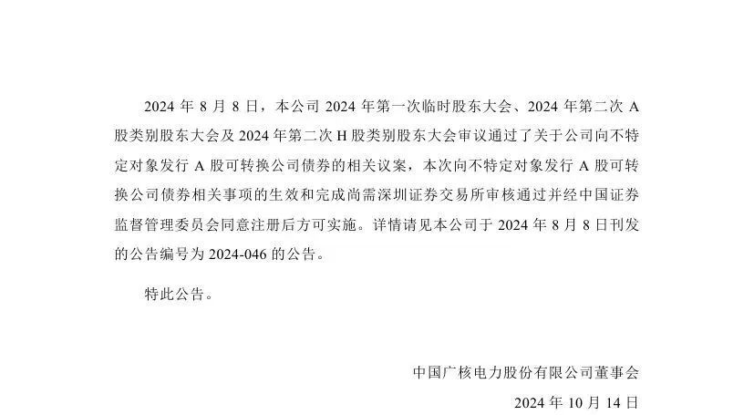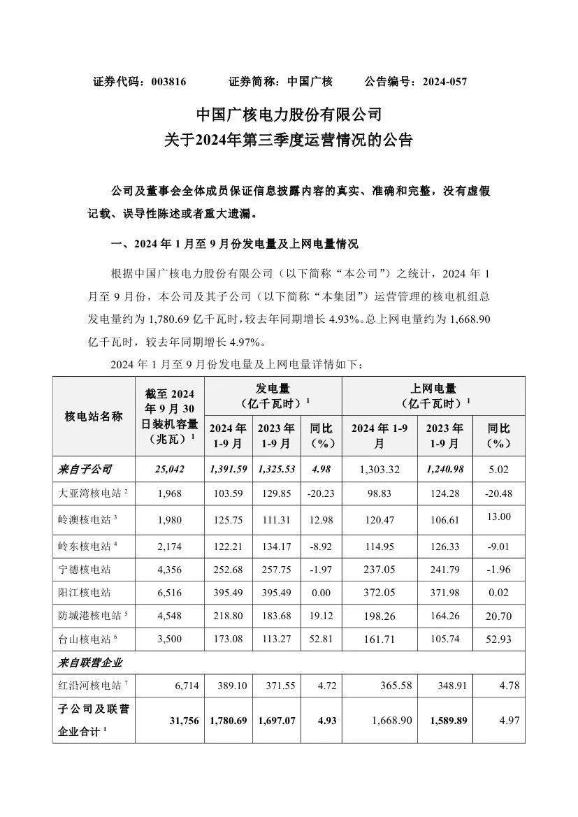 據悉,中國廣核近日披露2024年第三季度運營情況。