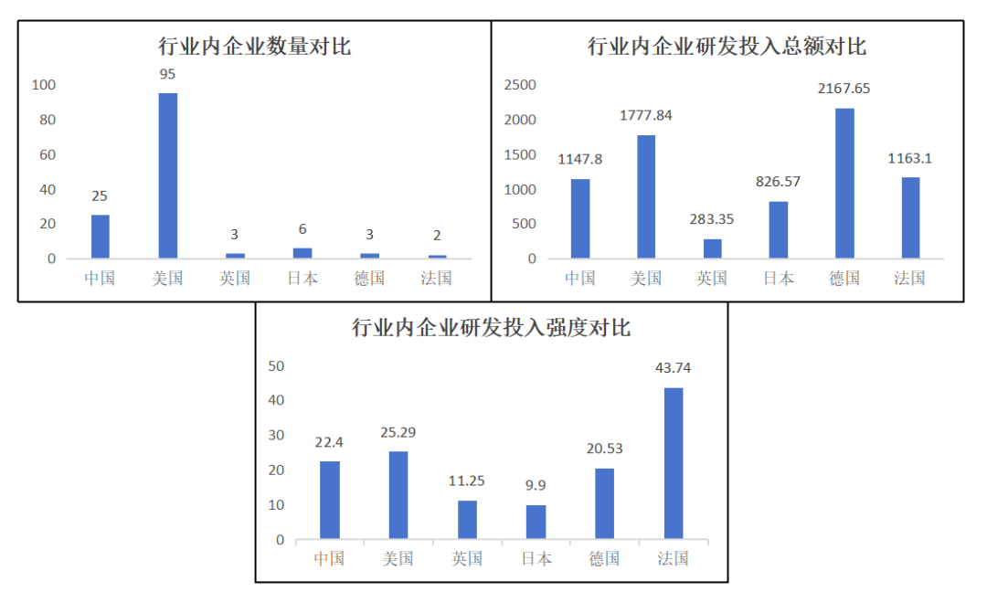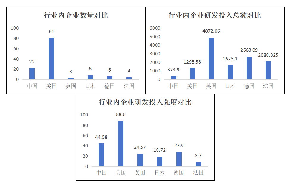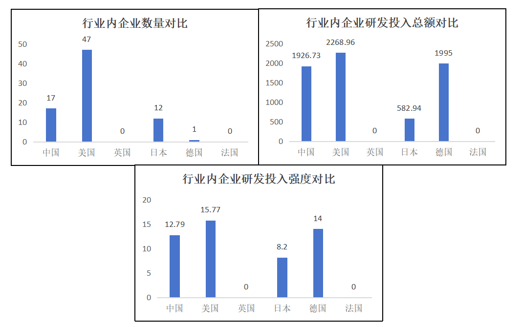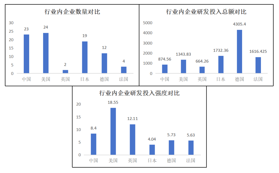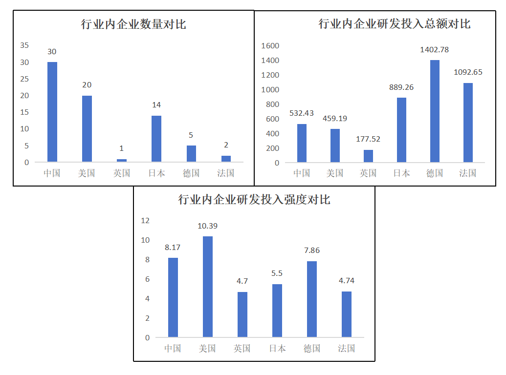 四是汽車和零部件行業上,中國科技領軍企業的數量優勢并不明顯;其平均研發投入總額僅略高于英國,處于較低的水平;其平均研發投入強度則大約處于中等偏上的水平??傊袊萍碱I軍企業在汽車和零部件行業上的發展比較一般,體量優勢不明顯,創新水平不高;在平均研發投入總額較低的情況下卻有著較高的平均研發投入強度,更是說明了我國汽車和零部件行業的營收情況不容樂觀。