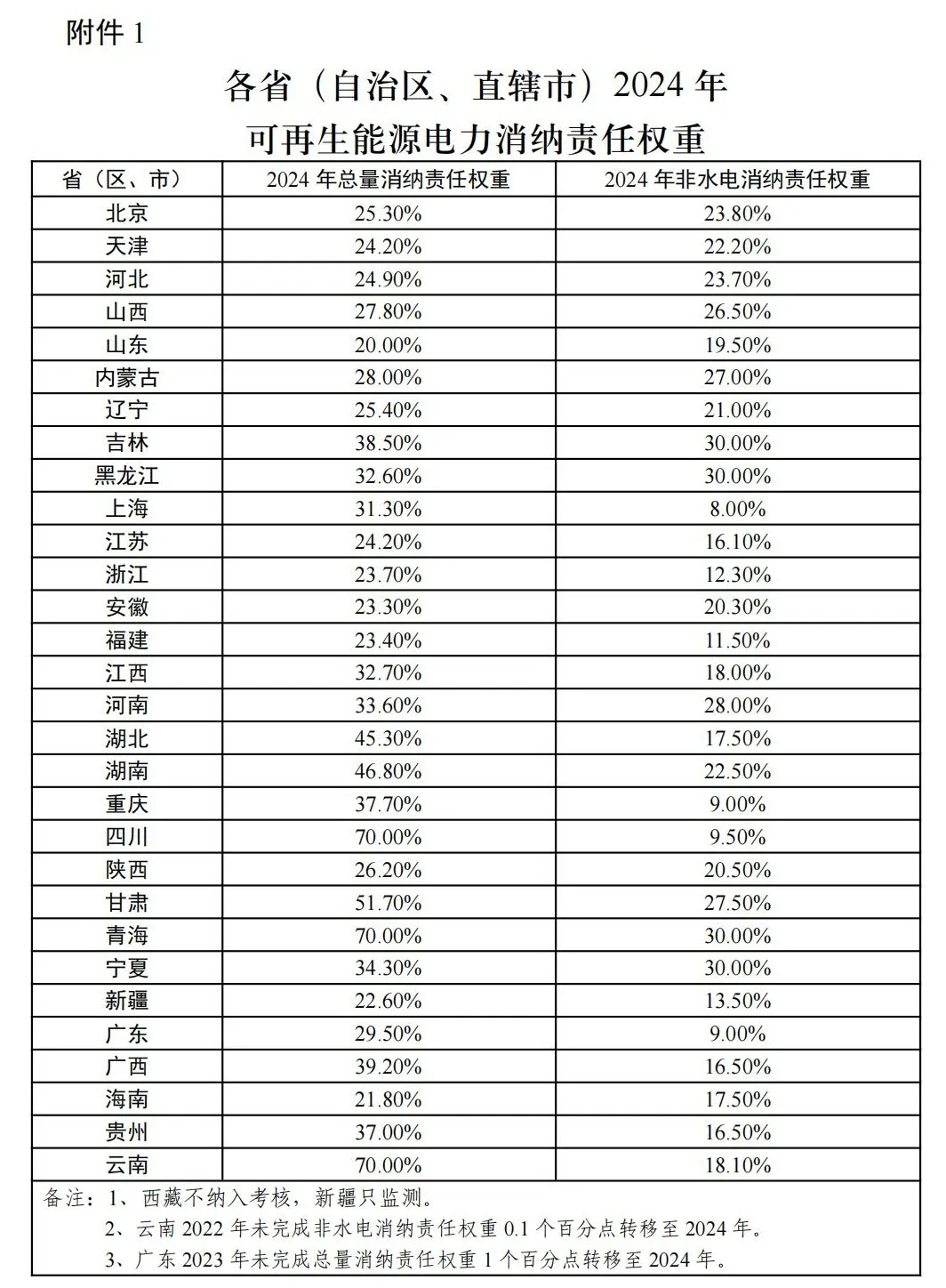 710日,國家發改委辦公廳、國家能源局綜合司聯合下發《關于2024年可再生能源電力消納責任權重及有關事項的通知》,下發了2024年、2025年,各省可再生能源電力和非水可再生能源電力消納責任權重。