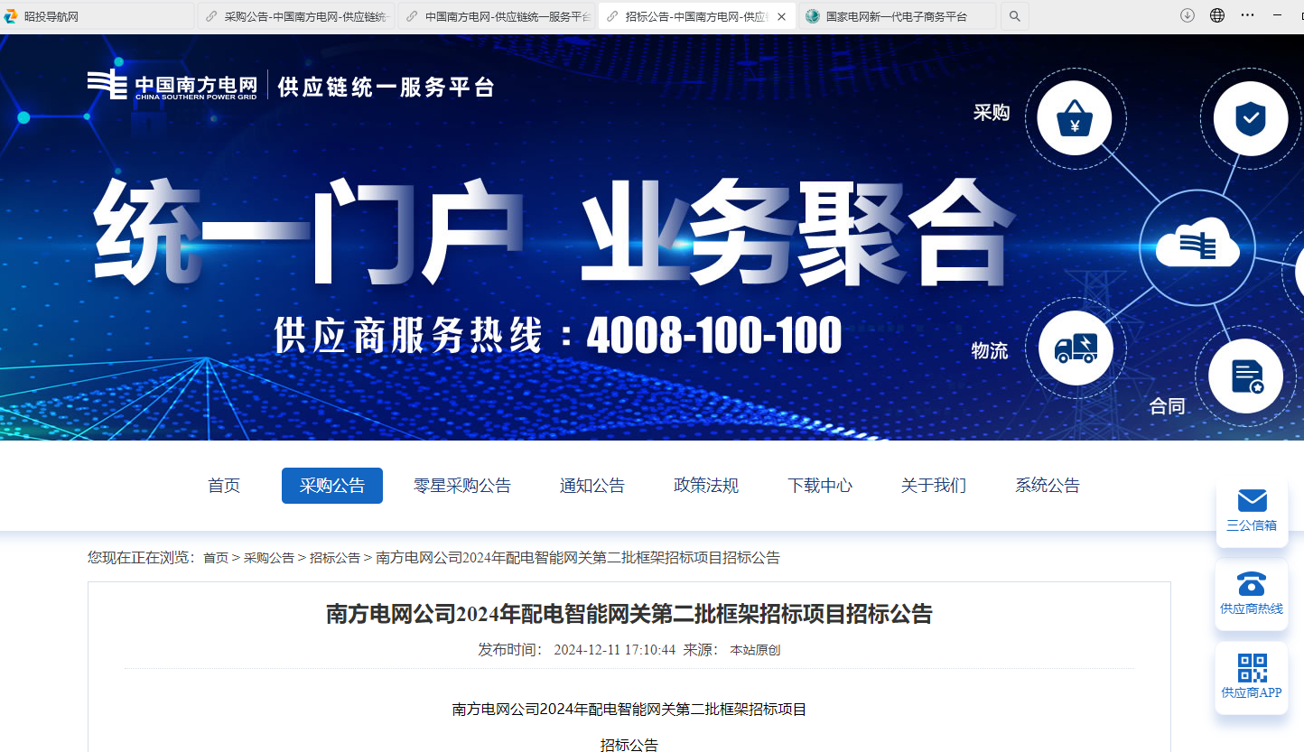 南方電網公司2024年配電智能網關第二批框架招標項目招標公告(項目編號:CG2700022001951745
