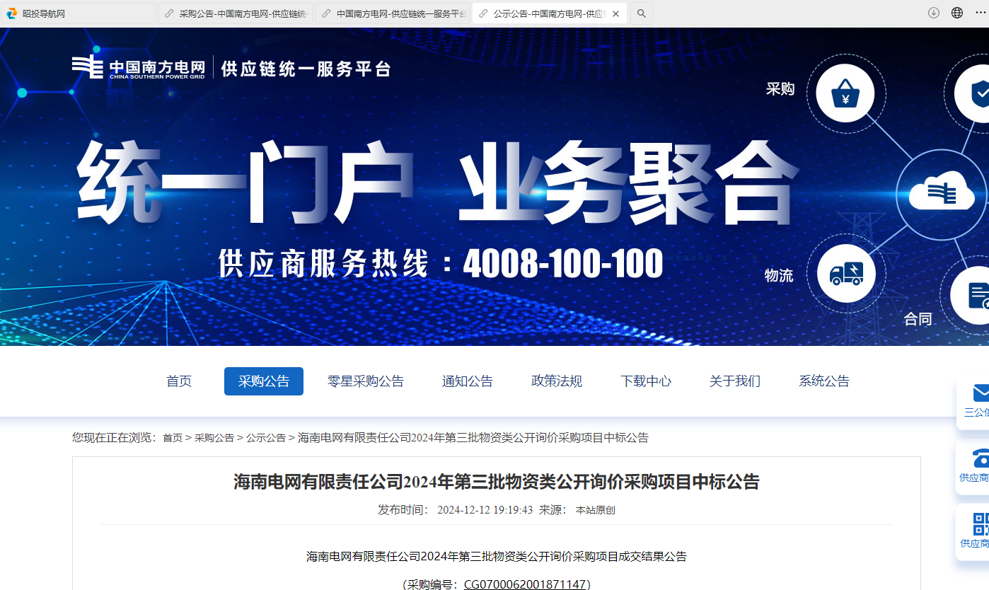 海南電網有限責任公司2024年第三批物資類公開詢價采購項目成交結果公告(采購編號:CG0700062001871147)