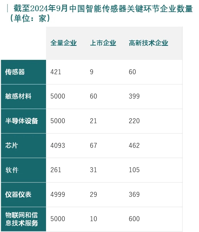 截至2024年9月,中國智能傳感器全產業鏈企業數量達到2.0萬家,其中,上市企業227家、高新技術企業2215家。“十五五”時期,隨著物聯網、人工智能、智能制造等領域的快速發展,中國智能傳感器在智能家居、可穿戴設備、智能移動終端等新興領域的應用將不斷增加。