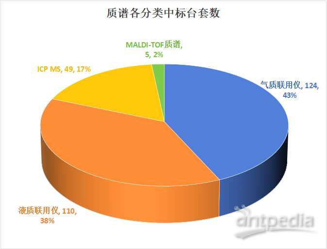 從質譜儀器的分類角度分析,本文涵蓋了氣質聯用儀、液質聯用儀、ICP MS以及MALDI-TOF質譜四大類別。在中標情況方面,氣質聯用儀和液質聯用儀占據了主導地位。具體來看,氣質聯用儀共中標124臺,占比達到43%;液質聯用儀緊隨其后,中標110臺,占比38%ICP MS中標49臺,MALDI-TOF質譜中標5臺。