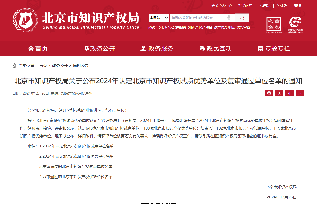 20241226日,北京市知識產權局發布《關于公布2024年認定北京市知識產權試點優勢單位及復審通過單位名單的通知》。經過嚴格初審、核驗和評審程序,北京康吉森自動化技術股份有限公司(以下簡稱康吉森股份)以卓越的科技研發實力、顯著的成果轉化能力以及完善的知識產權管理體系,成功被認定為北京市知識產權試點單位