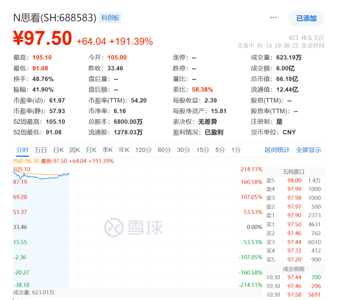 上市首日,思看科技開盤價為105/股,高開213.81%,市值一度超70億元。截至上午1030分,思看科技股價報97.5/股,漲191.39%,市值超66億元。