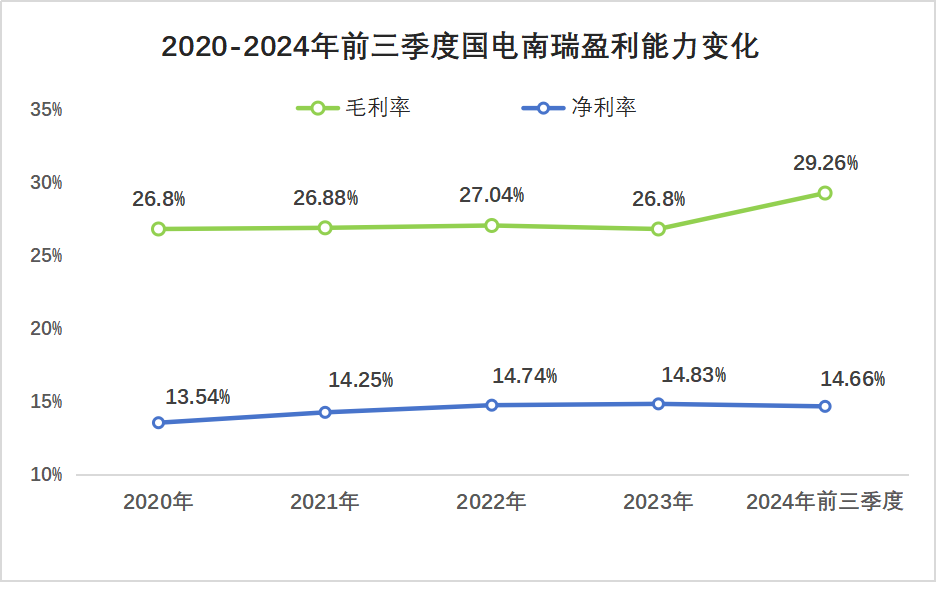 20202024年前三季度,國電南瑞毛利率從26.8%提高到29.26%,凈利率從13.54%提高到14.66%