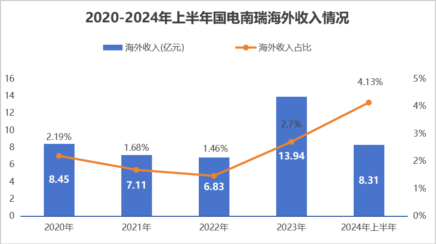 20202023年,國電南瑞海外收入從8.45億穩步攀升至13.94億,海外收入占比也從2.19%逐步提高到2.7%,增長勢頭強勁。2024年上半年,這一增長趨勢得以延續,公司海外收入占比進一步躍升至4.13%