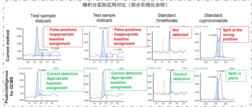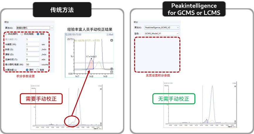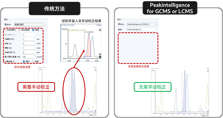 Peakintelligence亮點在于它只需選擇要使用的算法和模型,無需再設(shè)置任何積分參數(shù),即使是色譜峰基線分配困難、重疊峰、痕量小峰等復雜情況,亦可實現(xiàn)高水平的自動積分結(jié)果,大大簡化積分參數(shù)優(yōu)化及手動校正工作。