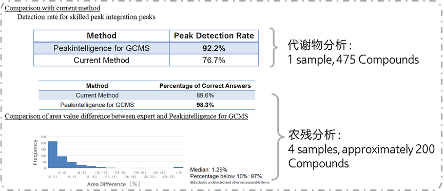 為進一步驗證積分結(jié)果的準確性,分別選取1個含有475種代謝物樣品和4個含有約200種農(nóng)藥殘留組分樣品的數(shù)據(jù)進行傳統(tǒng)方法和智能積分方法的分析比對,結(jié)果確證Peakintelligence可以重現(xiàn)90%以上專家積分結(jié)果。與此同時,經(jīng)驗豐富的操作員分別對兩組積分結(jié)果進行目視審查和手動積分修正,統(tǒng)計并比較數(shù)據(jù)處理的操作用時,結(jié)果顯示代謝物和農(nóng)殘兩類樣品定量分析時間均縮短至傳統(tǒng)方法的1/4,數(shù)據(jù)處理效率顯著提升。